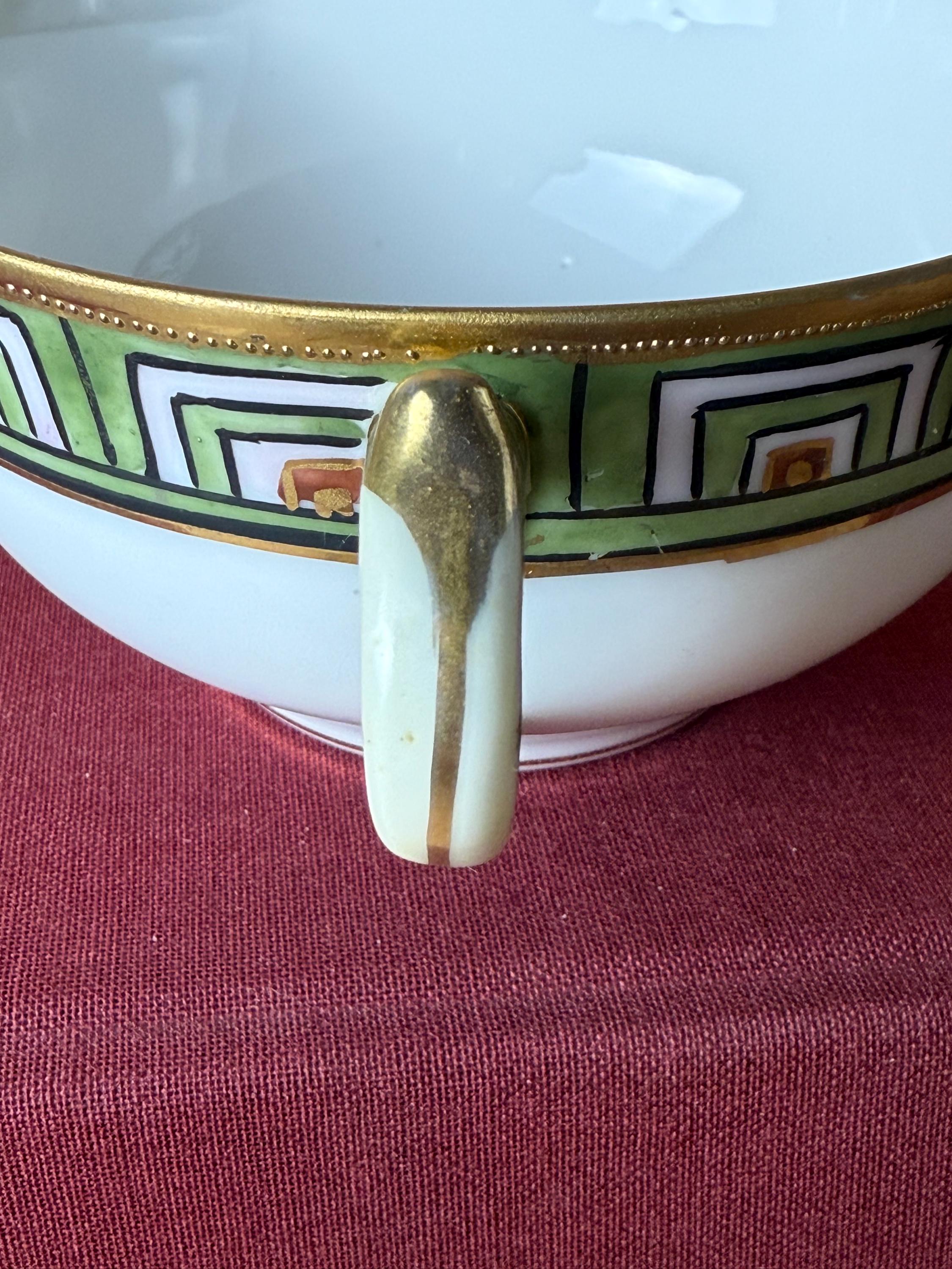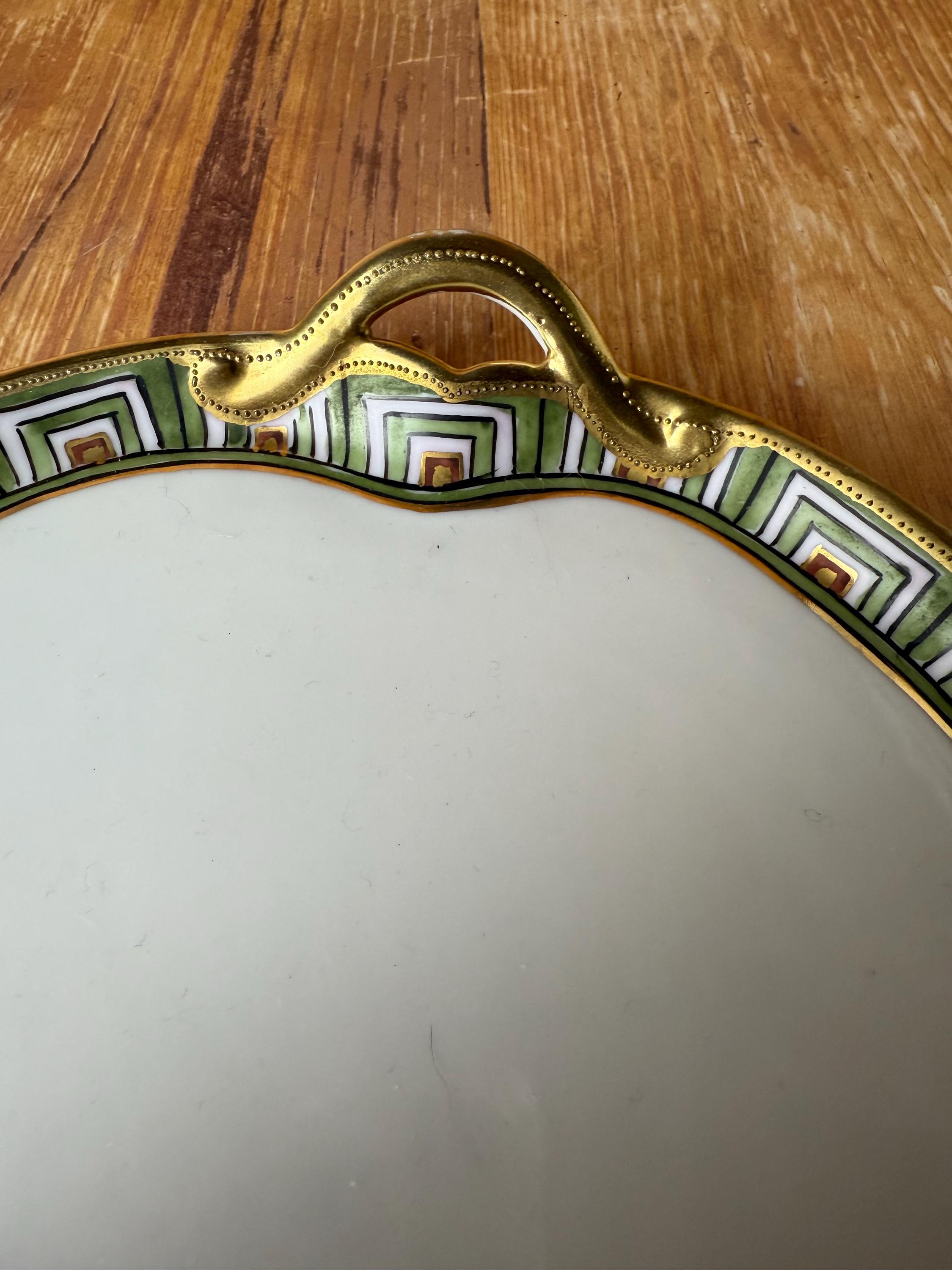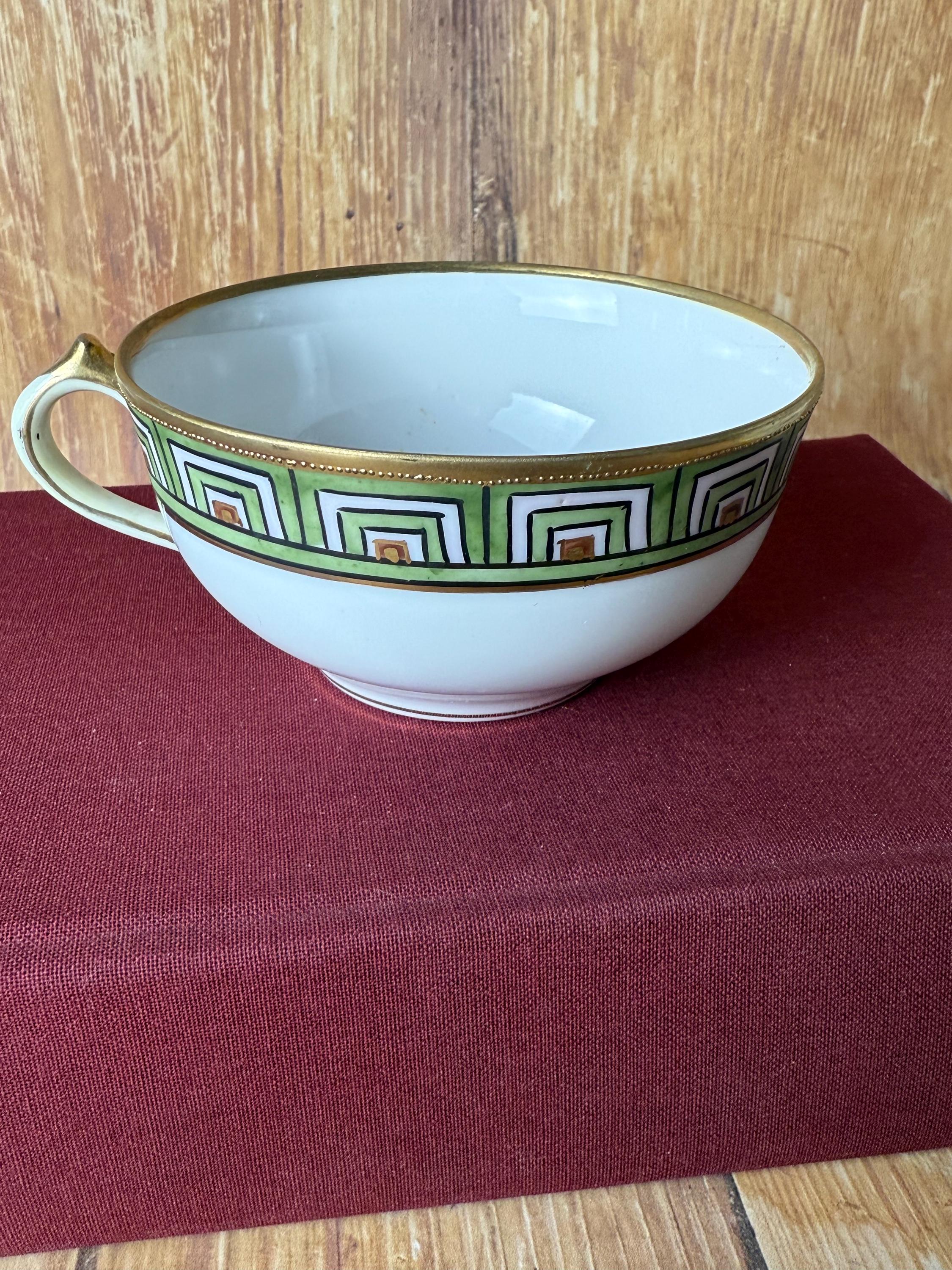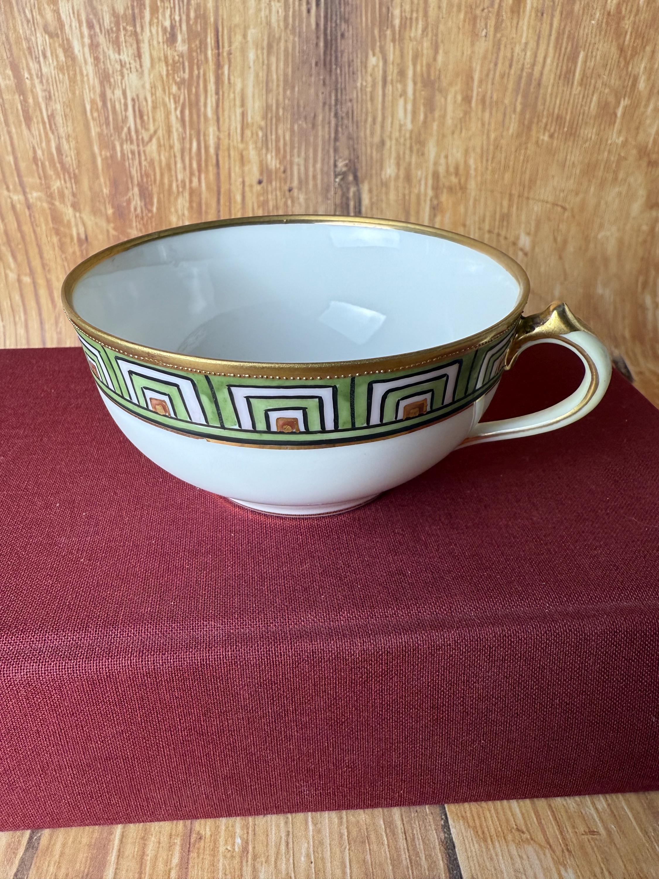 This rare antique Nippon snack set pairs refined craftsmanship with bold geometric elegance. Hand-painted in vibrant green, orange, and black over crisp white porcelain, the design features a hypnotic stepped Art Deco border trimmed in radiant gold. The cup nestles perfectly into the plate’s recessed rest — making it a charming set for tea, coffee, or small bites.