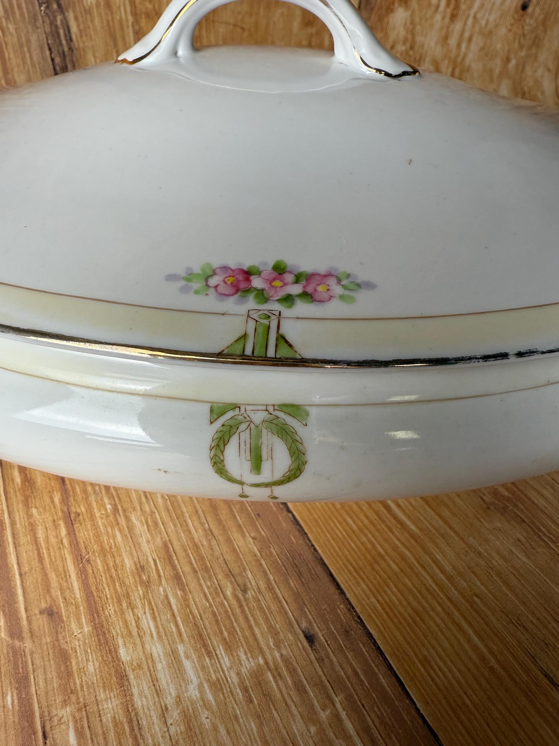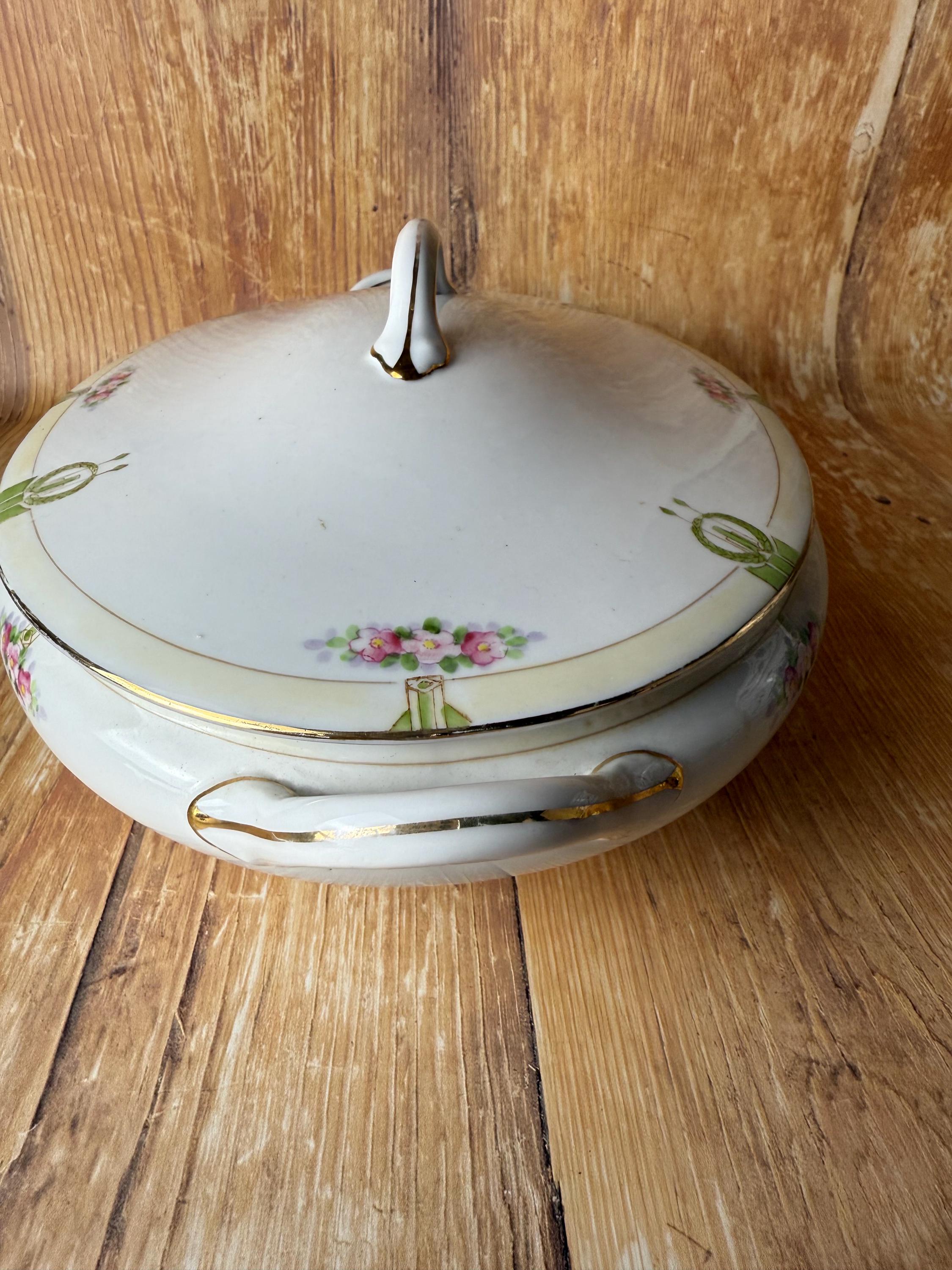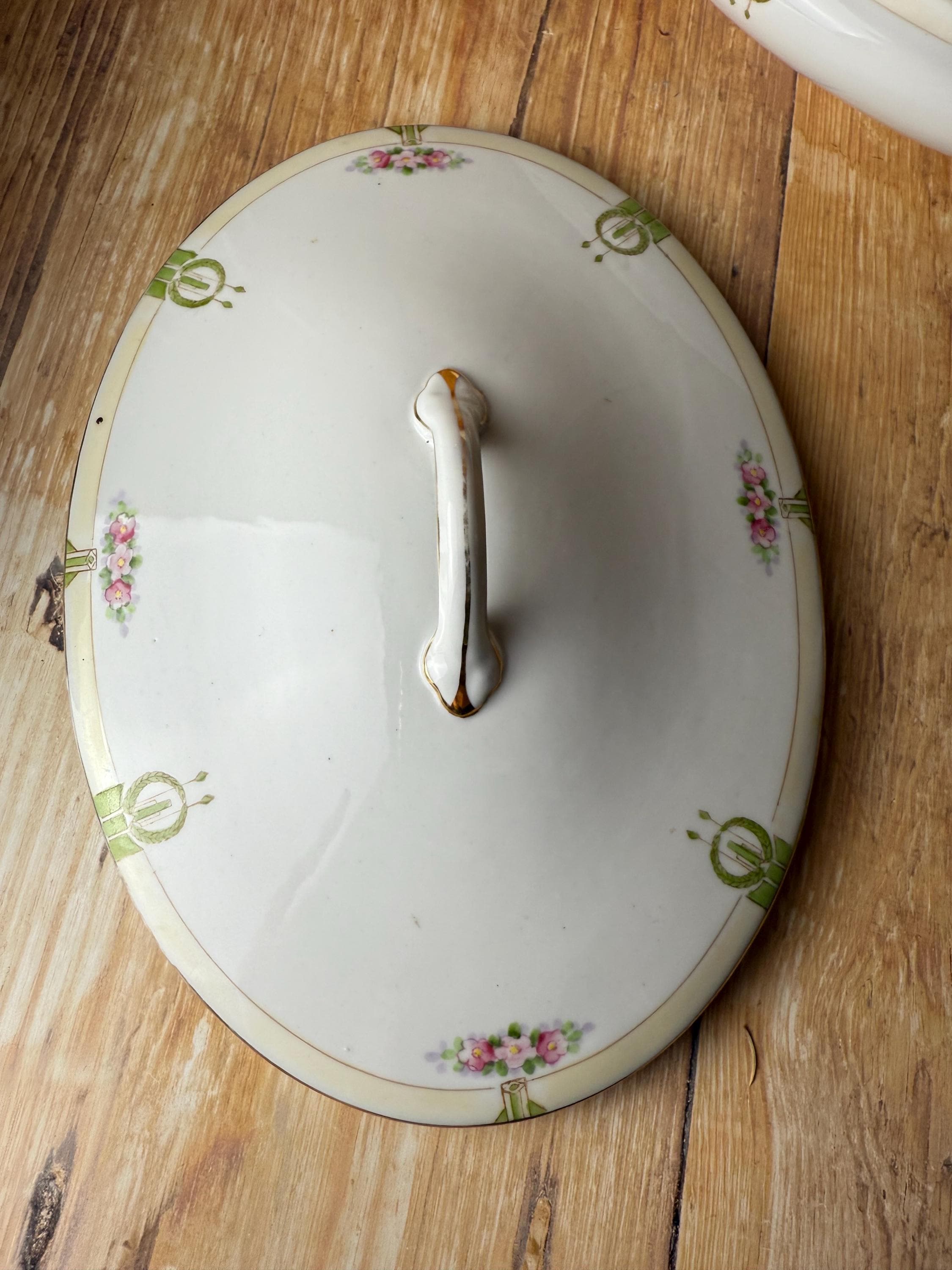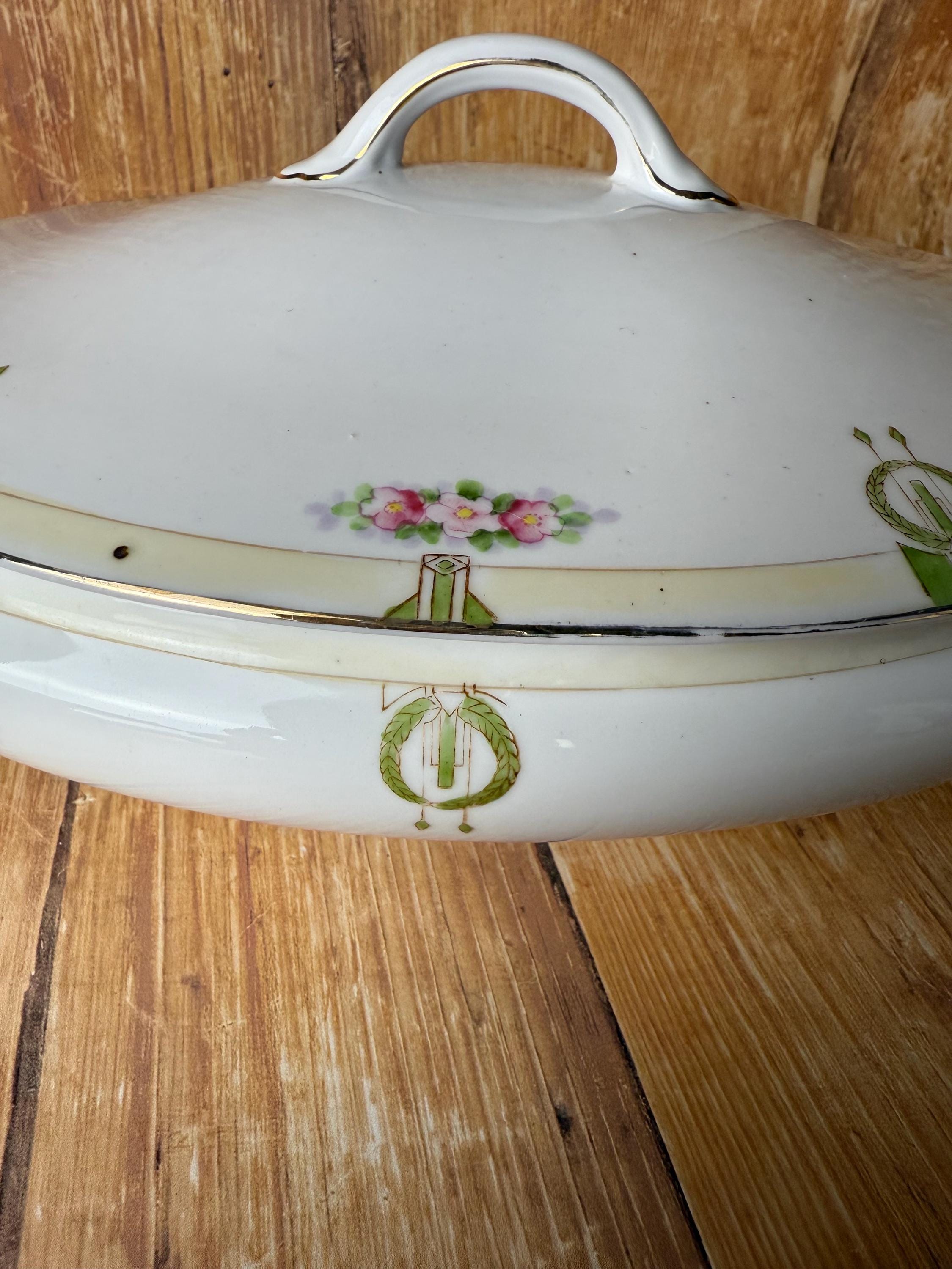 This exquisite antique Nippon porcelain covered dish is a beautiful example of early 20th-century Japanese craftsmanship. Measuring approximately 12 inches handle-to-handle and 5 inches tall to the top of the lid, this oval vegetable bowl features delicate hand-painted pink floral sprays, soft buttery yellow banding, and intricate green Art Deco-style garlands. The gilt detailing on the handles and lid adds a graceful shimmer, even after over a century. While it shows light signs of wear consistent with age—including gentle rubbing on the gold and faint age-related surface marks—it remains a showstopper for display or special occasions.