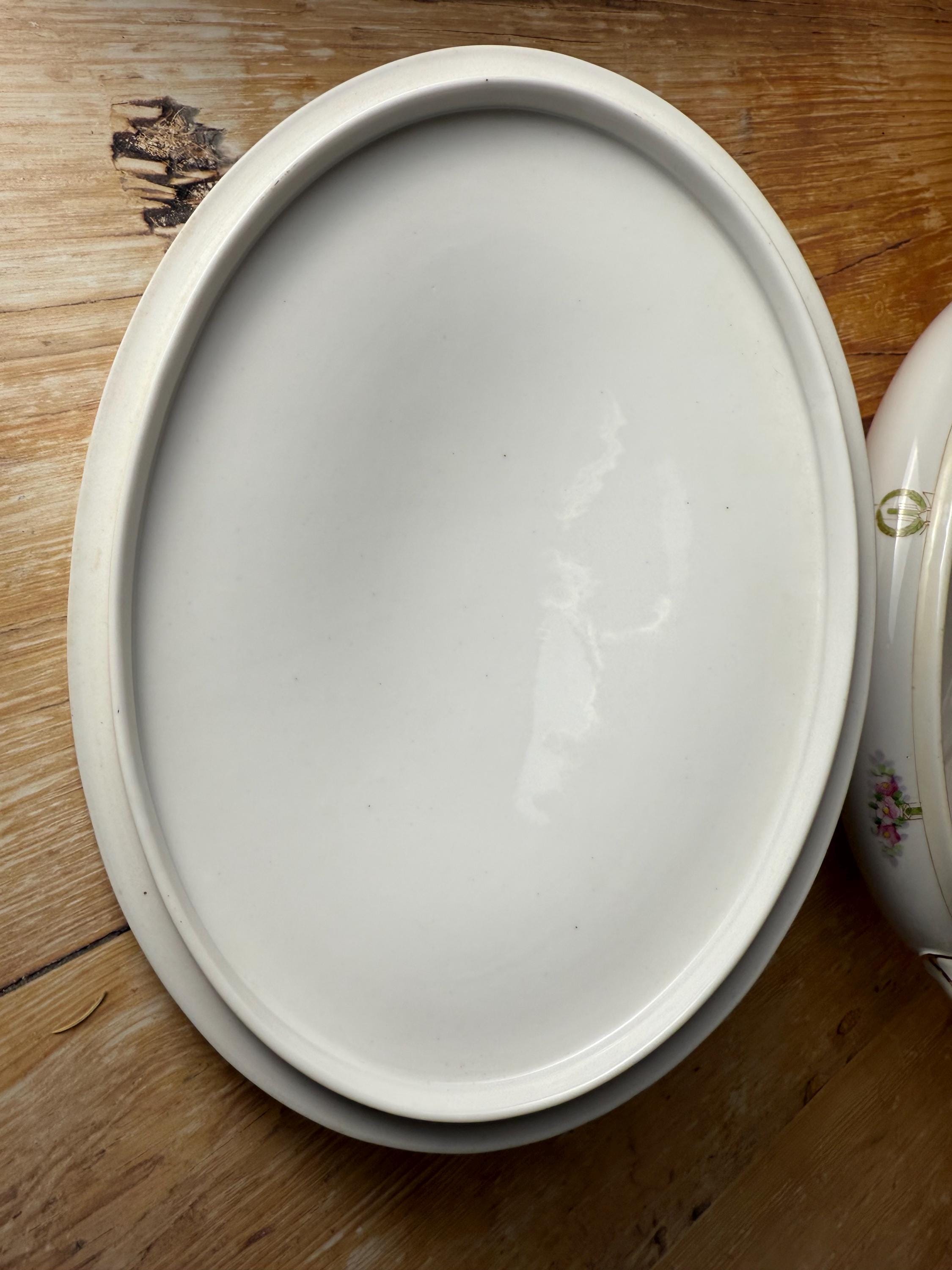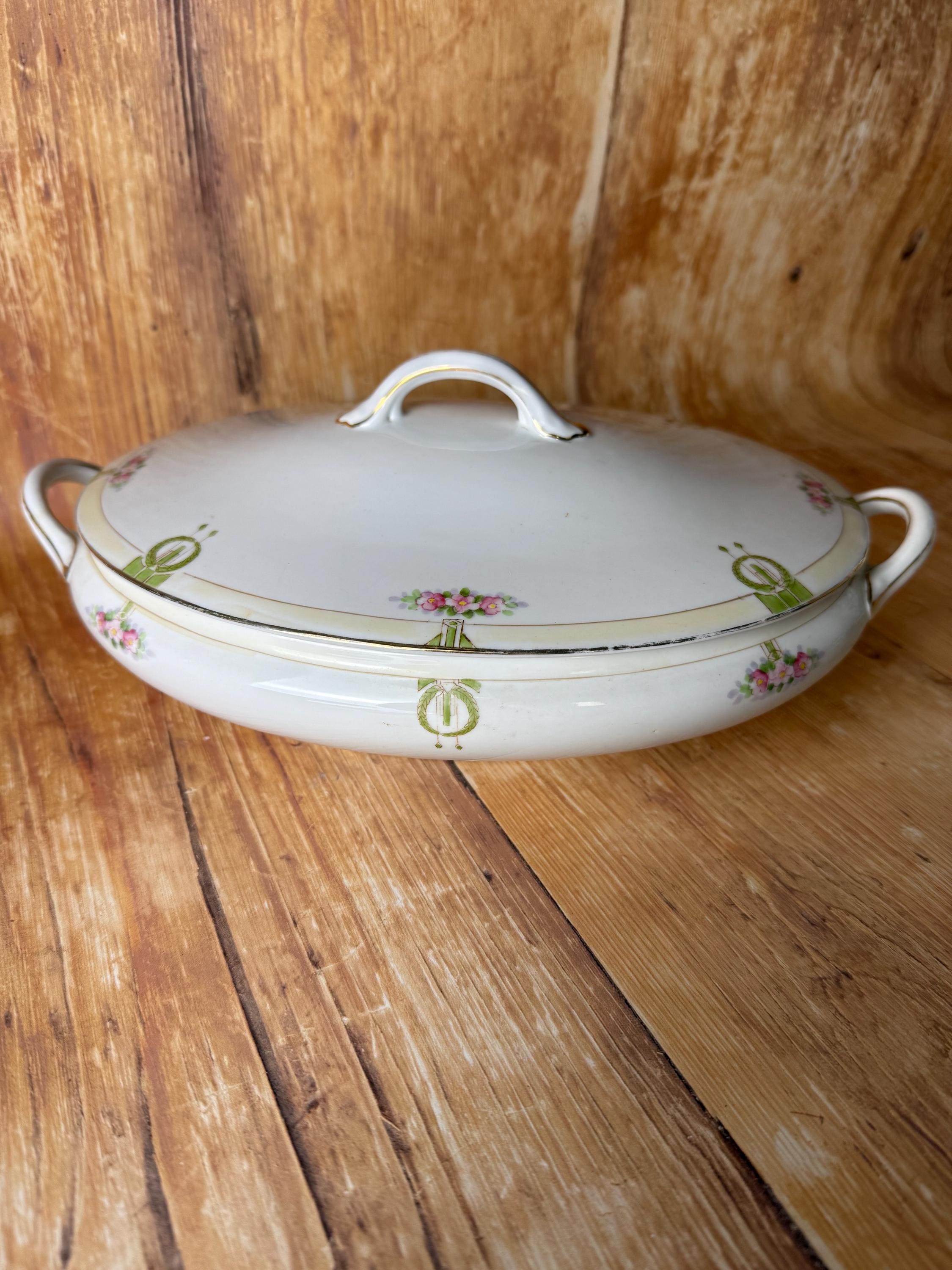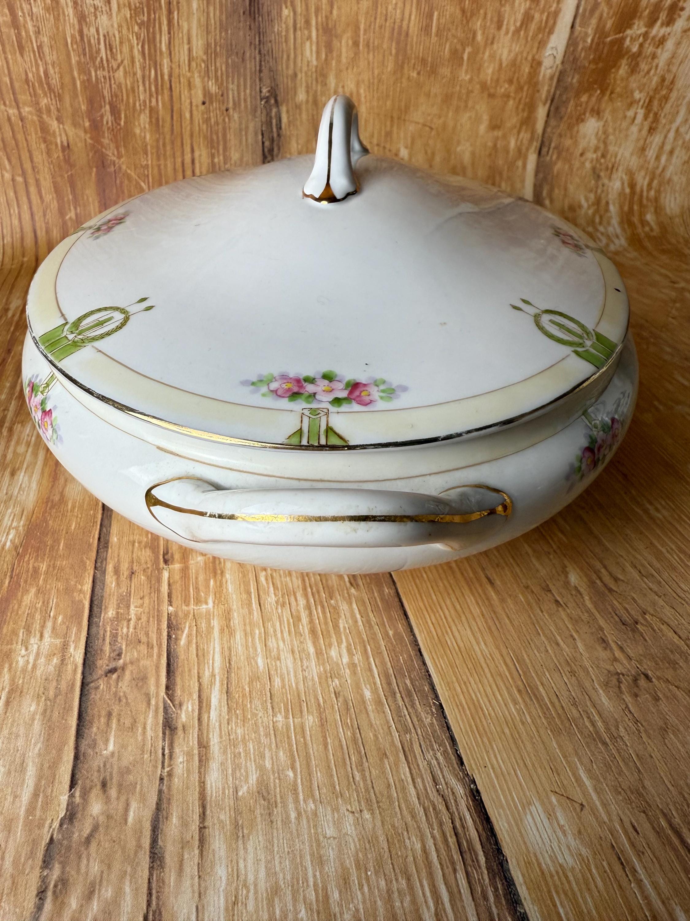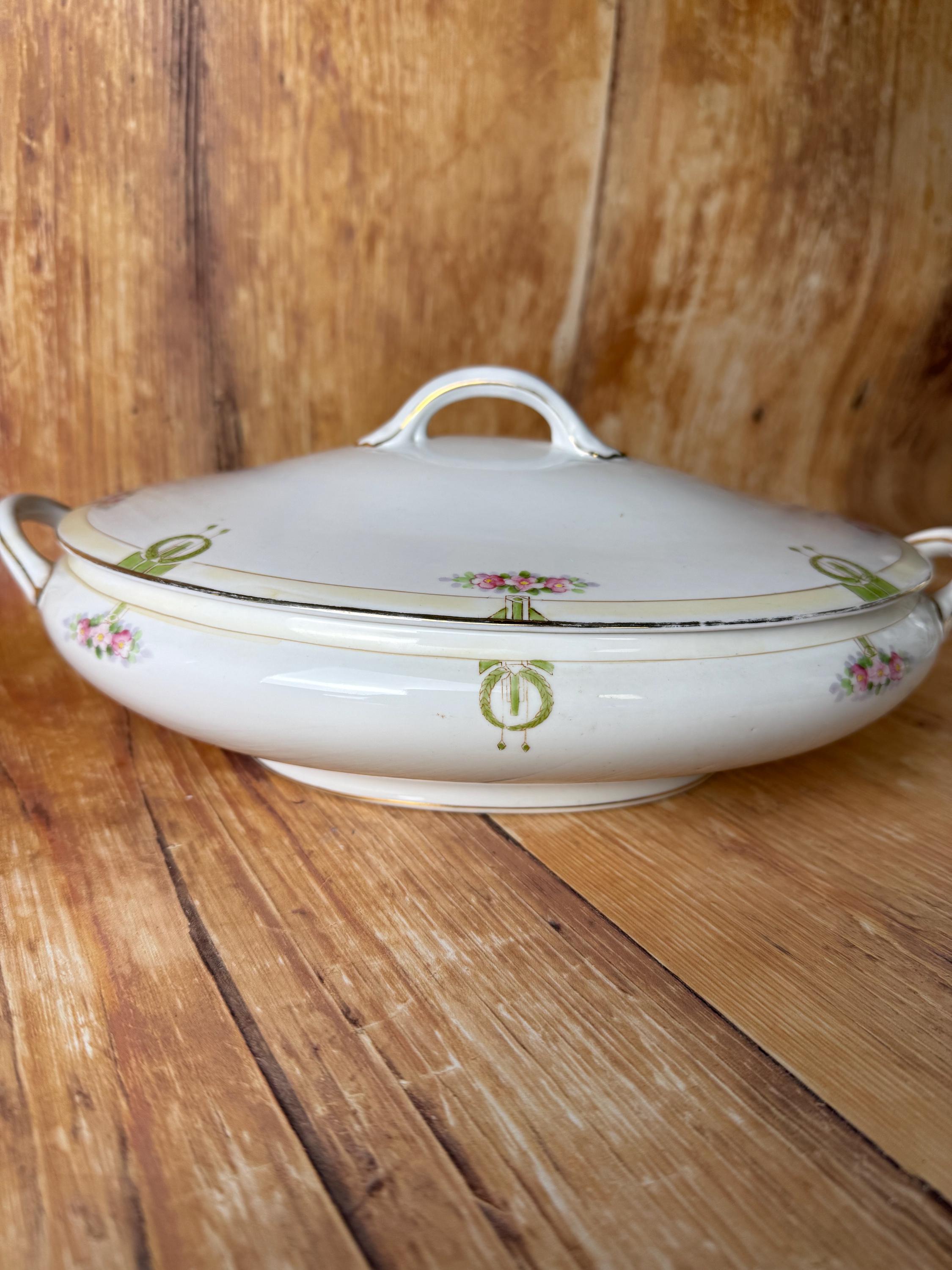 This exquisite antique Nippon porcelain covered dish is a beautiful example of early 20th-century Japanese craftsmanship. Measuring approximately 12 inches handle-to-handle and 5 inches tall to the top of the lid, this oval vegetable bowl features delicate hand-painted pink floral sprays, soft buttery yellow banding, and intricate green Art Deco-style garlands. The gilt detailing on the handles and lid adds a graceful shimmer, even after over a century. While it shows light signs of wear consistent with age—including gentle rubbing on the gold and faint age-related surface marks—it remains a showstopper for display or special occasions.