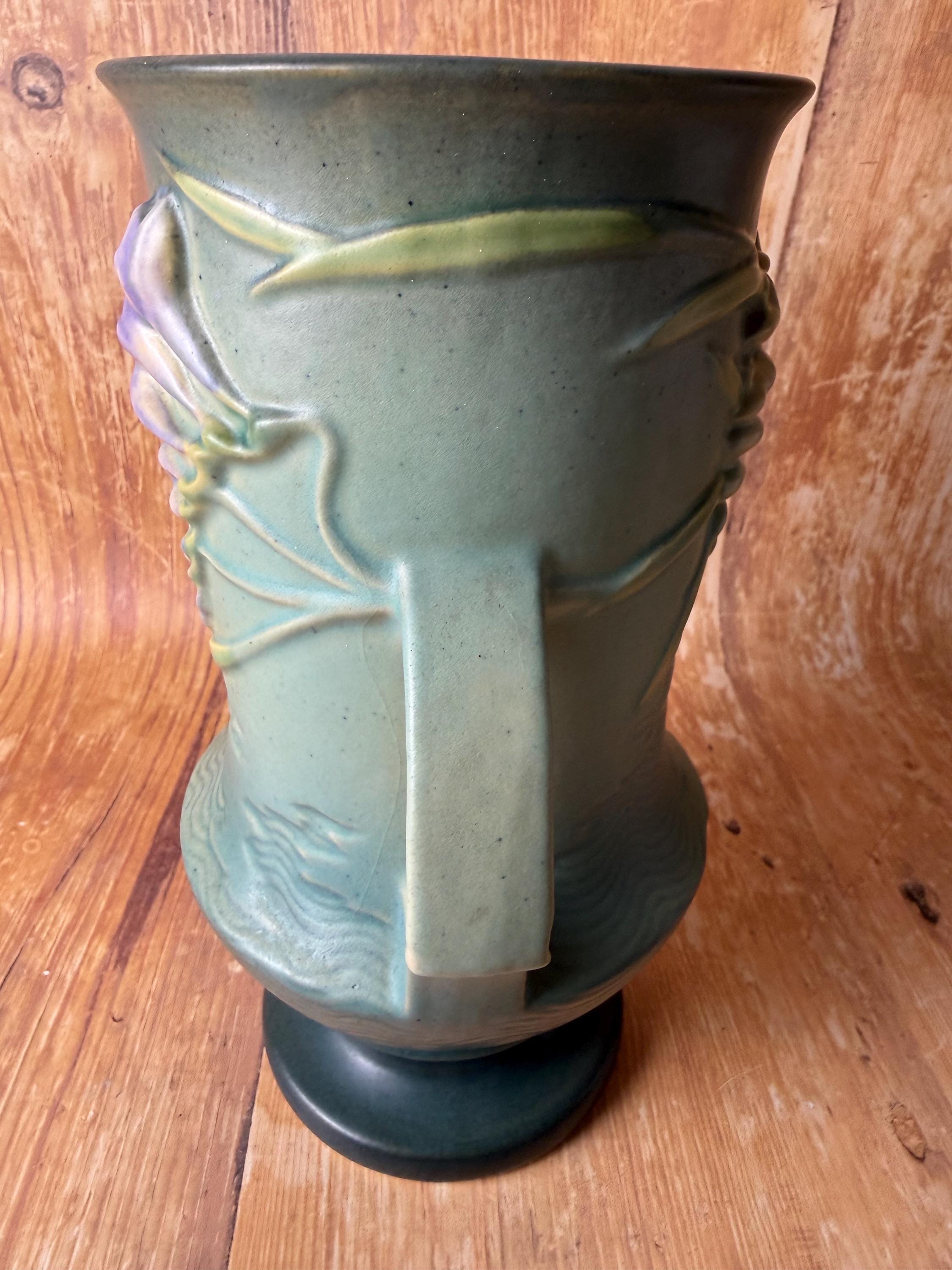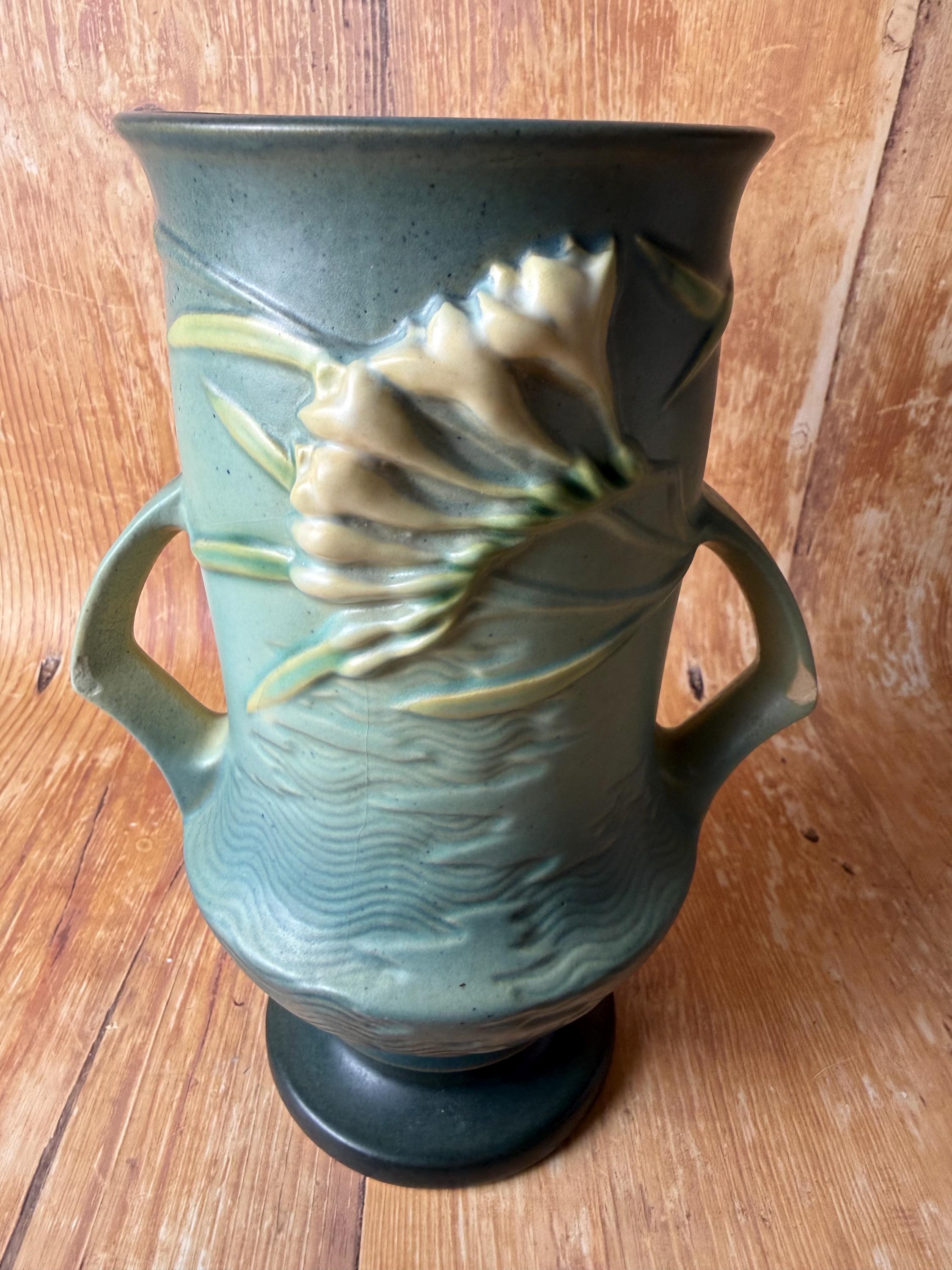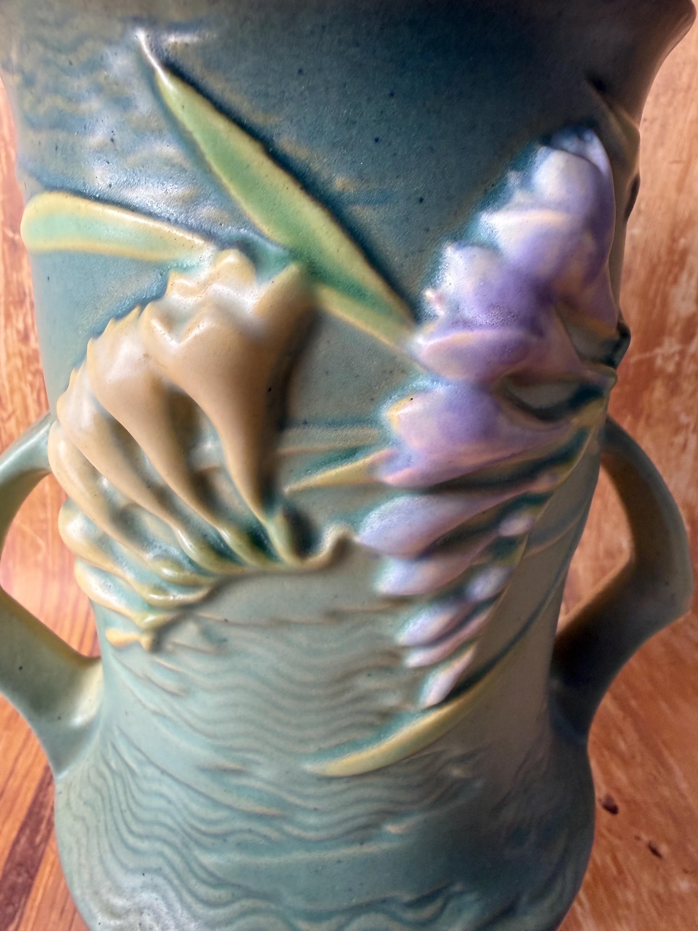 A true treasure from the golden age of American pottery, this stunning Roseville vase from the Freesia line (shape 123-9) showcases elegant double handles, a pedestal base, and a flowing relief of blooming freesia flowers in soft cream and lavender tones. The mossy green background has a subtle wave-like texture that feels both earthy and artful—classic Roseville craftsmanship at its finest.