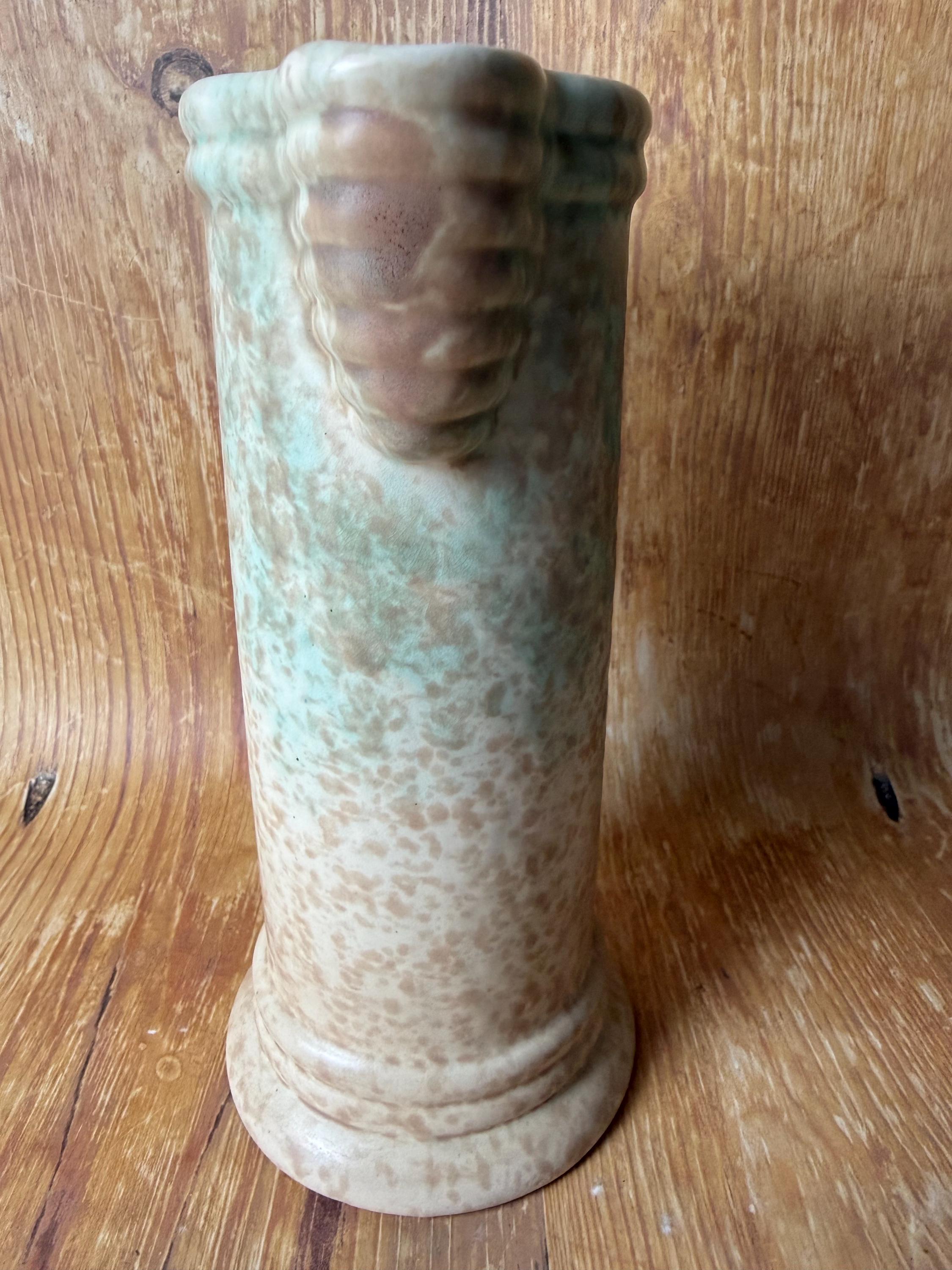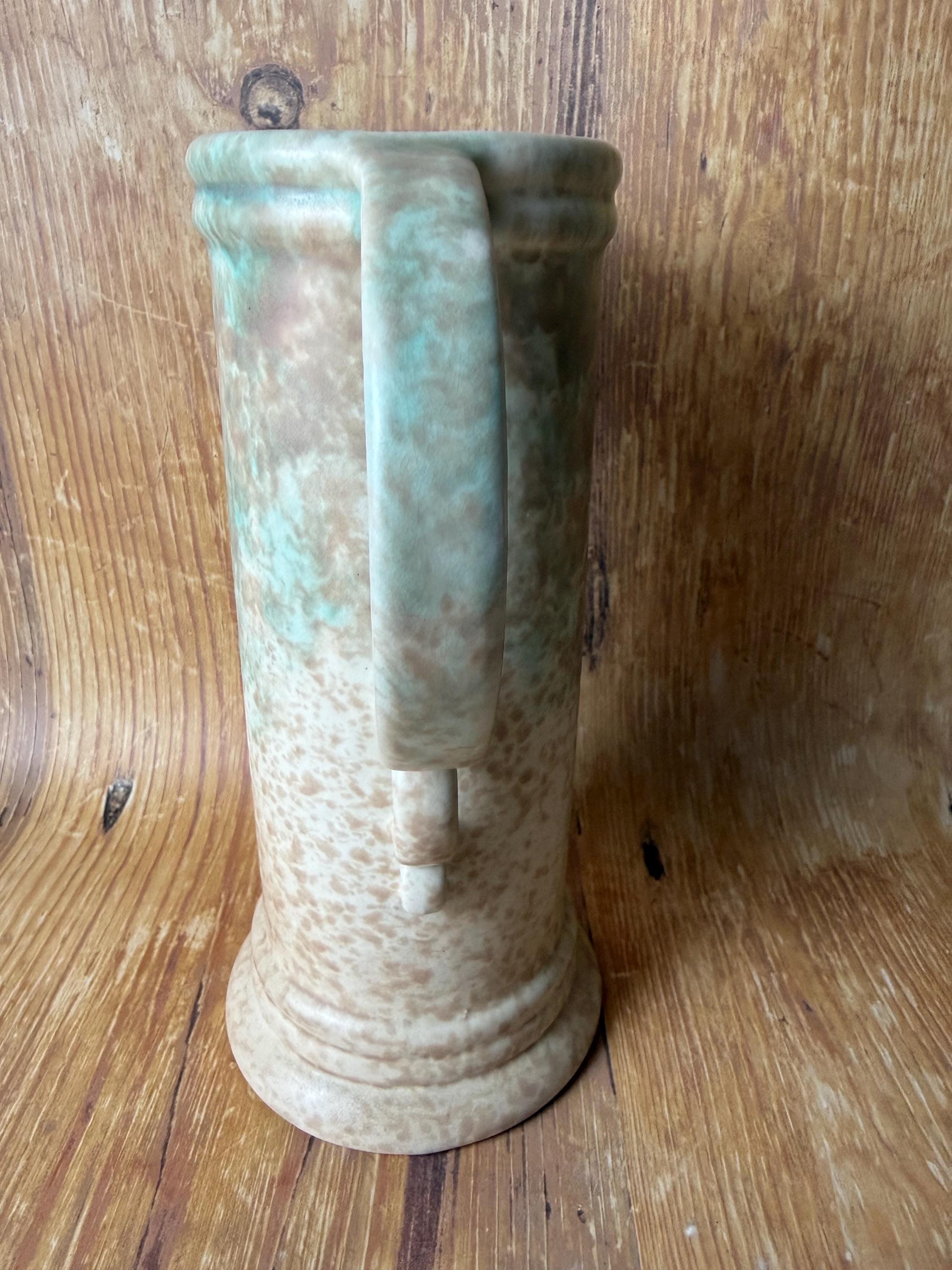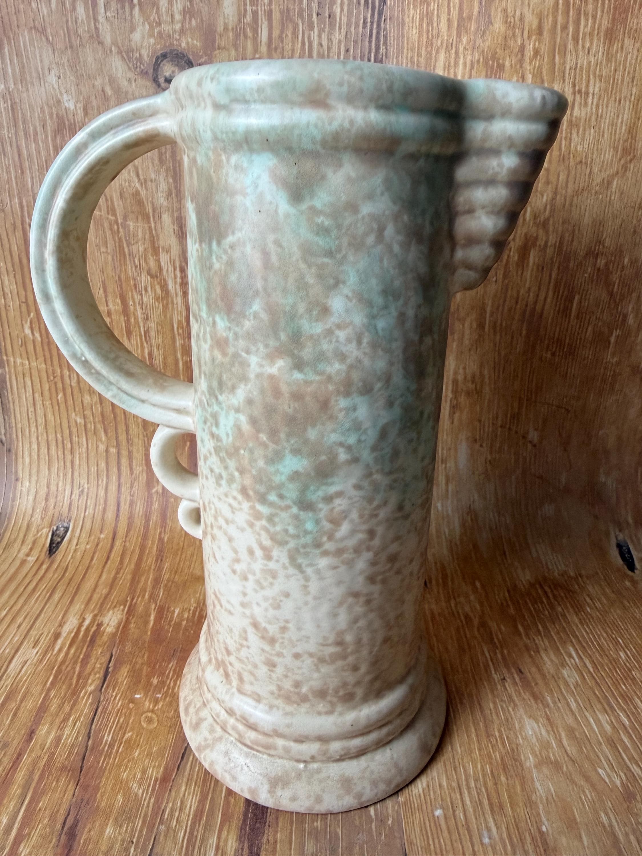 Add timeless charm to your home with this stunning vintage ceramic pitcher by Ducal, produced in Staffordshire, England during the mid-20th century. Featuring a soft speckled matte glaze in earthy tones of beige, green, and brown, this tall pitcher showcases clean, Art Deco-inspired lines with a wide spout and elegant looped handle.